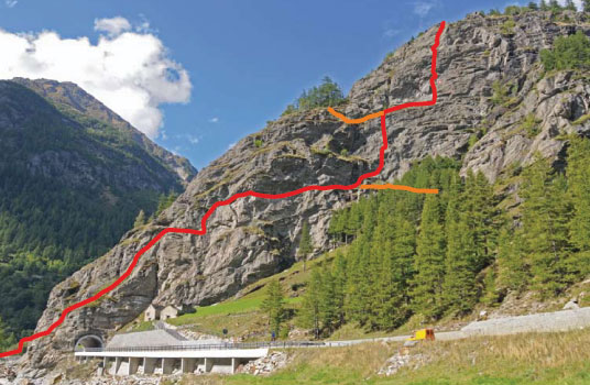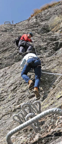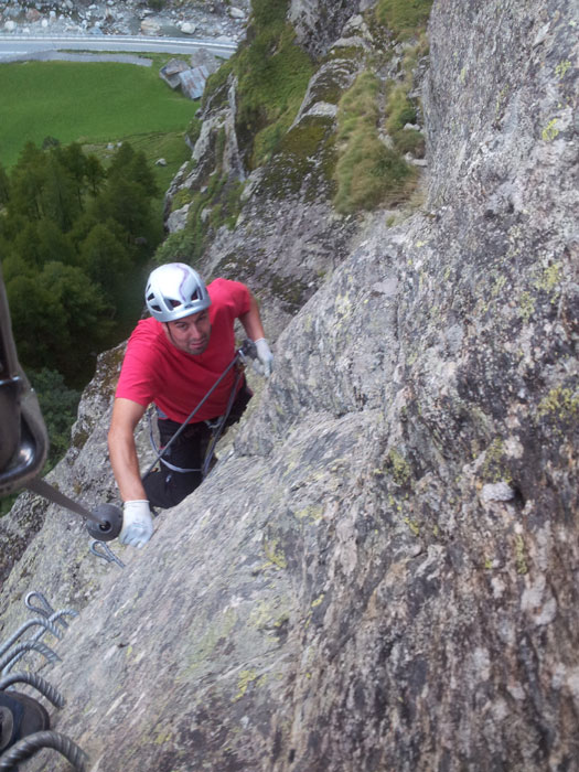Tout débute par un petit pont de singe (facultatif) au-dessus de la rivière, puis la voie serpente agréablement sur la face de rocher. La vue est plongeante et même impressionnante sur la route du Simplon dans la partie supérieure. Un échappatoire après la vire horizontale et un deuxième se trouve avant la dernière paroi verticale.