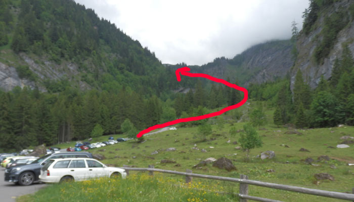 Monte en direction "Les Plans". Là, ça grimpe. Quand tu arrives aux Plans, tu pars sur la droite en direction de Pont de Nant. C'est une petite route bucolique dans la forêt. A 2,5 km, tu arrives dans une clairière avec un parking en face de toi ainsi que des restaurants.
