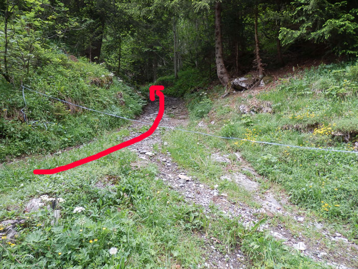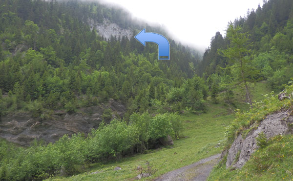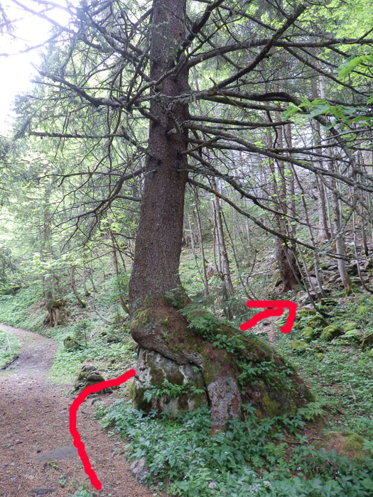 Du parking, monte la route carossable en pierre. Reste sur cette route, même s'il y a d'autres petits chemins qui semblent sympa. Après 2km, tu passes un pont (barrière en fer). Tu fais quelques virages assez serrés et en arrivant presque sur un plat, tu trouves un chemin sur ta gauche. (voir photo). Si tu sors de la forêt, tu es trop loin.