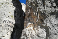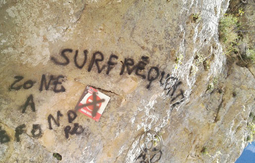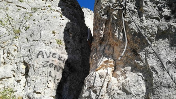 Les câbles des lignes de vie ont été sectionnés, les points d’ancrages et mousquetons tronçonnés, probablement à la disqueuse. Et les tags tracés sur les rochers qui pestent contre la « surfréquentation », la proclamant « Zone à défendre » (ZAD) ne laissent aucun doute sur les motivations de ces extrêmistes. Ils n’aiment pas les promeneurs qui viennent violer leur sanctuaire sauvage. Il y a eu 8'000 via ferratistes en 2014.