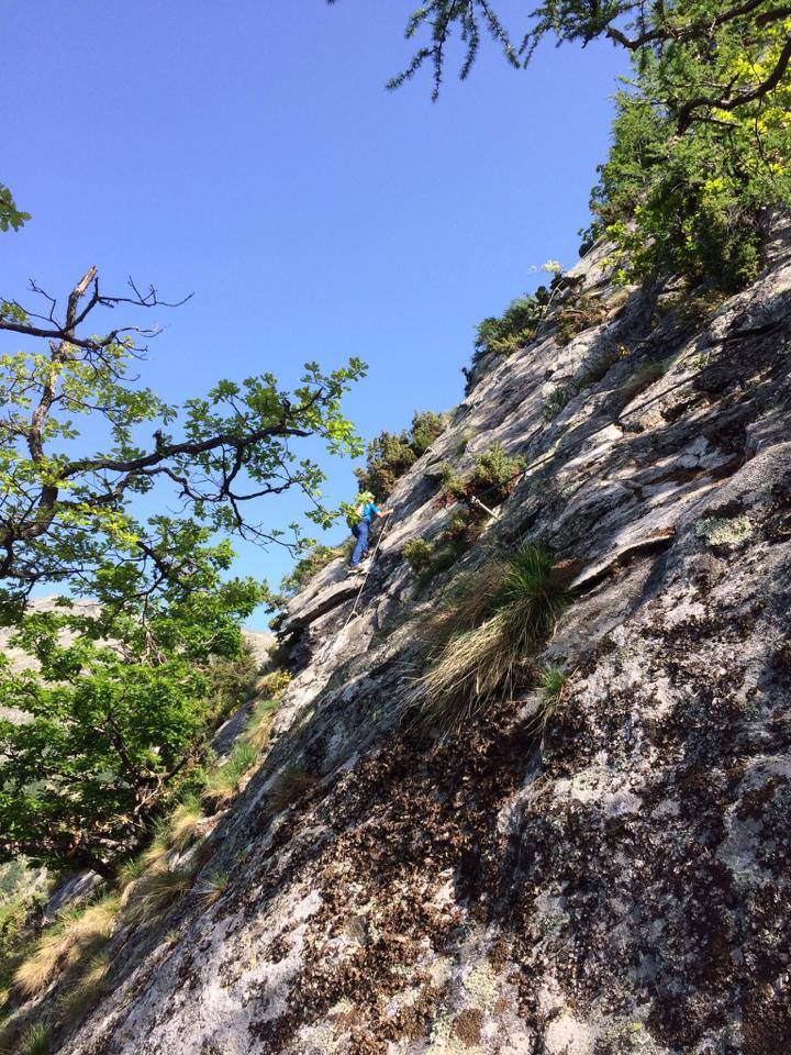 Ca comment par une montée "droit en haut" le long d'un rocher et tu te trouves assez rapidement au-dessus des arbres. C'est abondamment équipé et le gaz commence à se faire sentir.