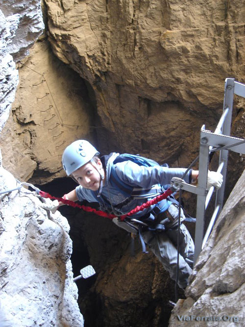 Dans la roche, les marches traditionnelles en métal ont été remplacés par des pieux, des clous. Si tu tombes ça fait mal et tu peux être embroché. Tu es averti.