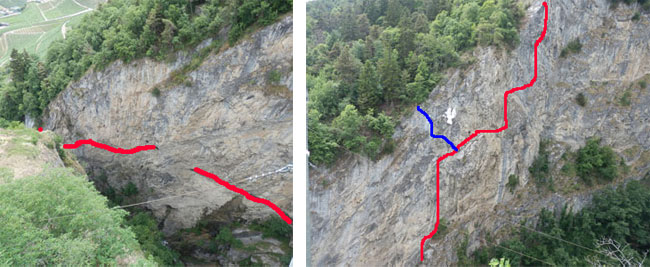 La deuxième partie commence par un passage assez soutenu pour les bras avec un léger dévers. C'est assez physique mais tu peux te reposer dans une grotte qui passe sous la passerelle à Farinet. Ensuite tu continues à monter, ça devient de plus en plus physique et tu trouves un échappatoire.