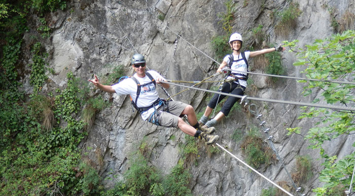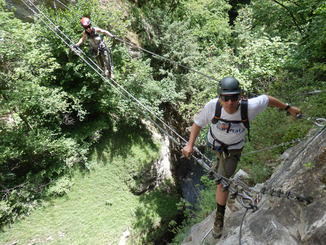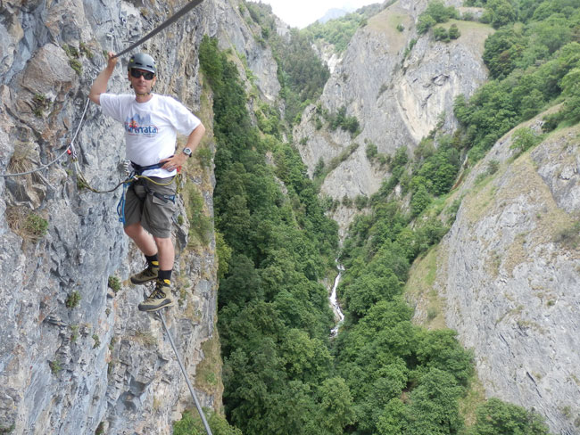 Ca commence assez fort avec un pont népalais (voir photo) très aérien qui branle pas mal. Cerise sur le gâteau, tu dois changer tes longes 3 fois durant la traversée. Si là, tu coinces, c'est un signe de ne pas y aller.