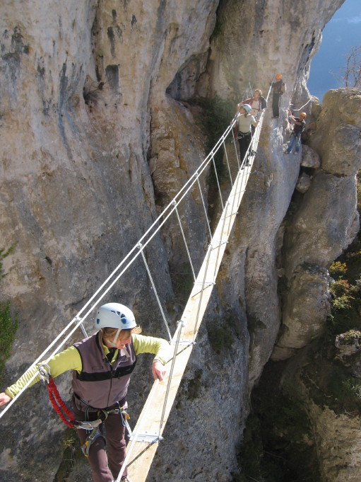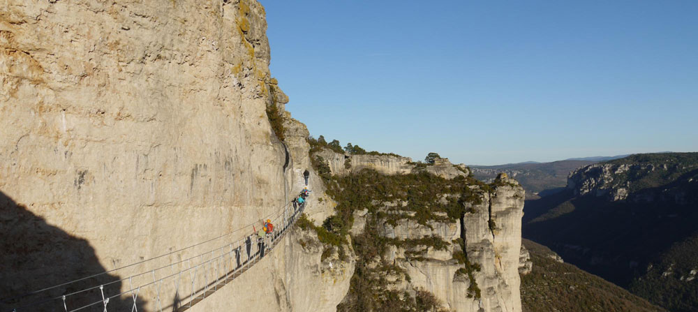 La via propose une successions de passerelles et de ponts de singe qui passent d'une rive à l'autre du torrent dans les Gorges de la Truyère.