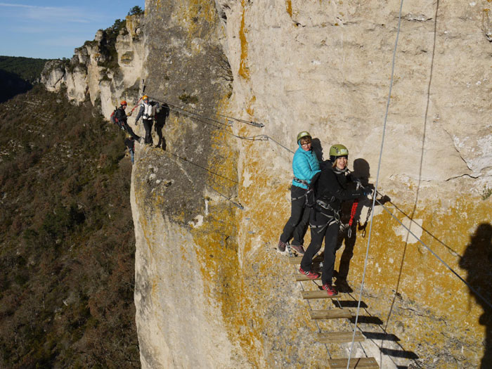 Au cœur des Gorges du Tarn, la via surplombe le village de Liaucous. Tu y trouves deux via avec 2 niveaux: Bleu: peu difficile et Rouge très difficile qui se croisent et décroisent.