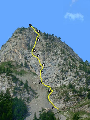 Elle se fait sur une belle paroi triangulaire en calcaire compacte et verticale. Pas de grande difficulté technique mais «tire bras» et un peu de gaz sur la fin.