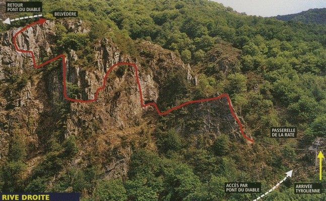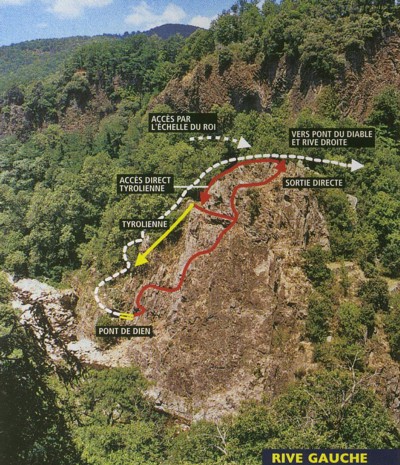 AccèsLa via ferrata du Pont du Diable évolue de part et d'autre de l'Ardèche juste en amont de l’historique pont de pierre. On l'atteint depuis le parking du stade de Thueyts, par l'exceptionnel passage de l'Echelle de Roi, courte et raide descente au milieu de la coulée basaltique, qui te conduit au sommet de la première partie (rive gauche).