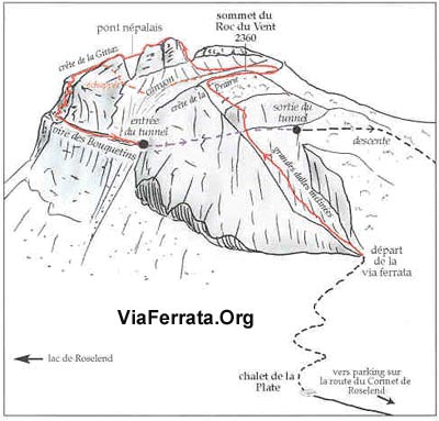 Possibilité, par une courte cheminée située 20 mètres après le pont népalais, de rejoindre le plateau en échappant à la tour et au pont. Attention sur l’accès de la cheminée, il y a un trou de plusieurs mètres de profondeur légèrement en contrebas de celle-ci. Par une sente, trouve la vire des bouquetins qui t'amène à l’entrée du tunnel. De l’autre côté, après une belle terrasse, retrouve le sentier qui amène au chalet de la Lauze et de là au Plan de la Laie.