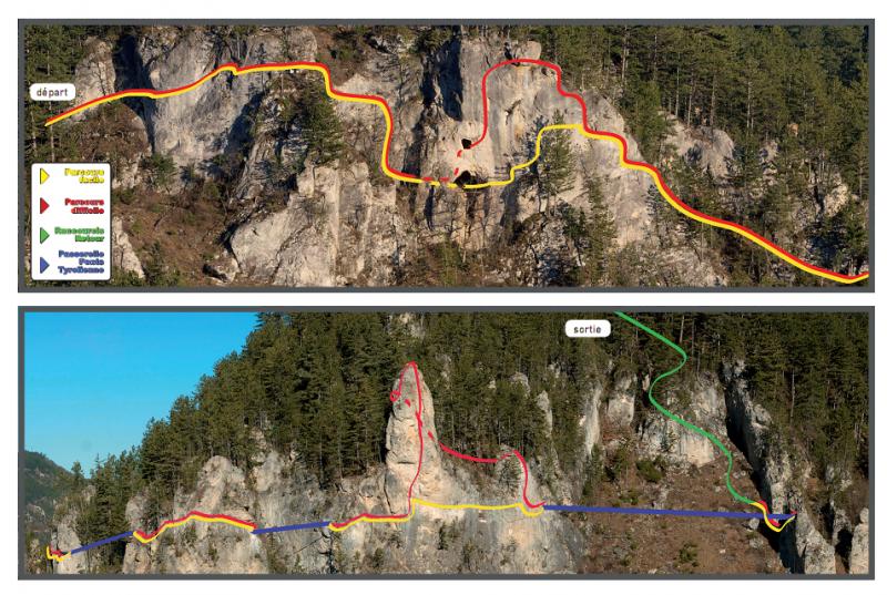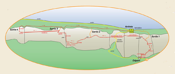 L’itinéraire devient commun jusqu’à la base d’un pilier d’une trentaine de mètres. Le parcours difficile dessine un tracé vertical pour sortir au sommet et rejoindre le parcours facile qui reste horizontal et permet d’atteindre la tyrolienne (35 m).