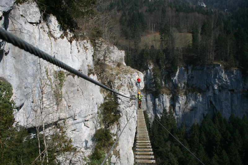 Then you cross a grassy ledge to reach the base of a beautiful wall where the equipment forces you to position your body correctly (the Wall of the Right Move). A series of traverses, sometimes rocky, sometimes grassy, lead you to the "moving" part of the itinerary: the footbridge.