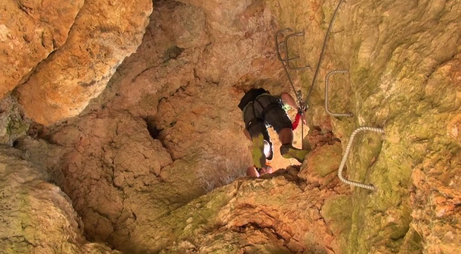 La via ferrata démarre horizontalement pour atteindre une cavité rocheuse. De là, 2 parcours se présentent, un difficile, l’autre facile. Le parcours difficile emprunte une lucarne. A sa sortie, le tracé vertical de 6 m qui s’en suit, sollicite fortement les bras. Peu après, ce parcours rejoint le parcours facile.