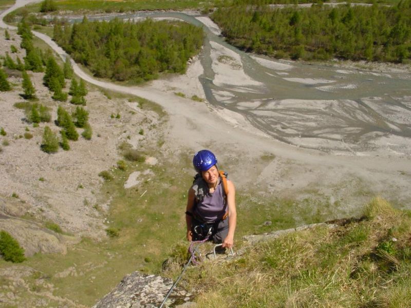 La première partie, qui s'étale sur une vingtaine de mètres, est une bonne mise en jambe avant le plus beau passage de la via. Une dalle permet de s'élever sur le fil gauche d'une belle arrête. Tu débouches alors sur une vire herbeuse, avec échappatoire à droite.
