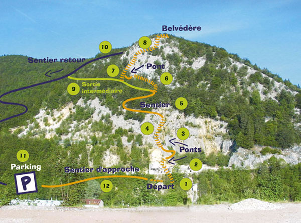 Un premier parcours est dédié aux enfants et à l'initiation. Deux autres variantes sont possibles avec une tyrolienne.