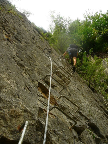400 m à gauche, un panneau indicatif marque le départ de la via ferrata.Via Ferrata