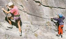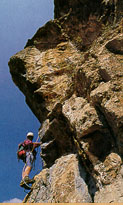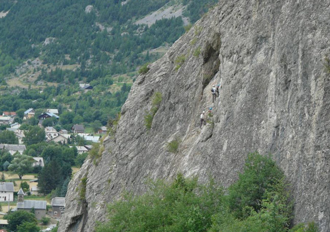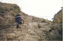 Prises directes sur le rocher, grands distances entre les attaches de la ligne de vie.