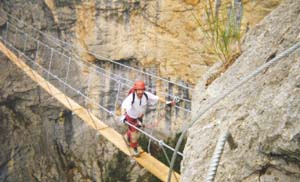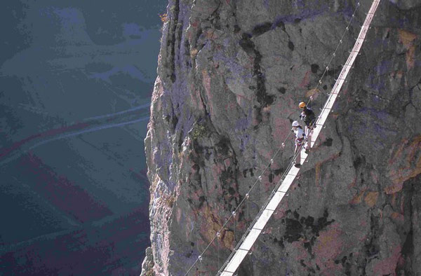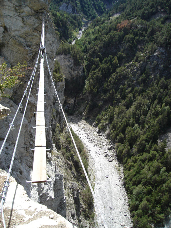 Tu continues avec une traversée sympathique... et là... là, là... comme nous tu auras de la peine à trouver tes mots. Cette dernière partie débute immédiatement par une sensation de vide énorme. Il y a plus de 200 m sous tes petits pieds! Les marches sont assez distantes l'une de l'autre, comme les attaches du câble. Dès que tu arrives à l'échelle du vide, tu auras encore droit à un surplomb qui finira d'user tes bras.
