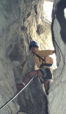 Ensuite, tu sorts de la via, par un passage assez délicat. Fais attention de ne pas balancer des cailloux sur la tête de tes potes qui se trouvent dessous.