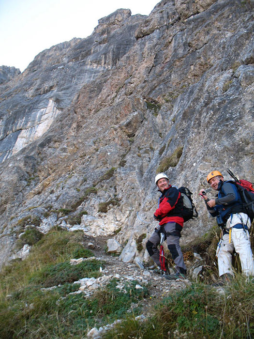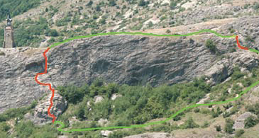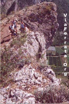 There are few indications and markings, so you must have faith. When you arrive at the summit of the lifts you will see the Kuklos rotating restaurant. Look towards the restaurant. A mountain with a cliff rises in the background to its right. This is where you will find the Tour D'Aï ferrata.