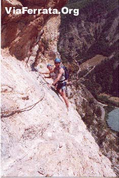 Calcaire, exposée en plein Sud. Bien intégrée au site, peu de barreaux et une passerelle très spectaculaire à 80 m du sol! Beaucoup de contacts avec le rocher.