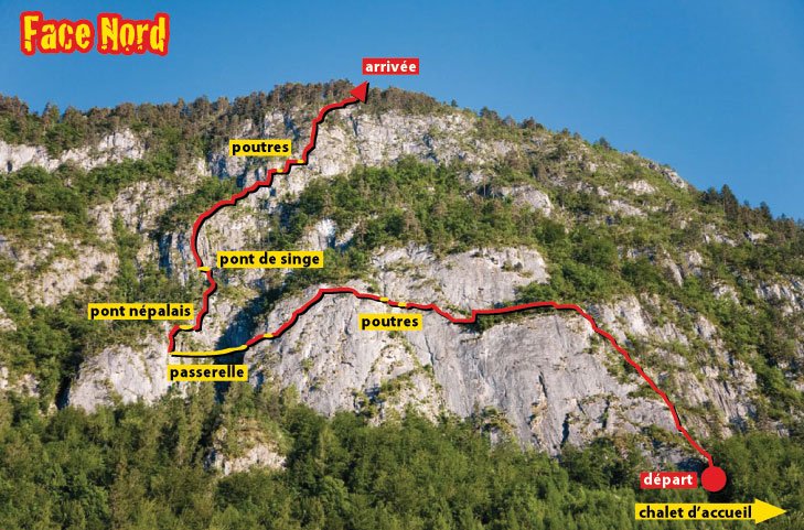Deux parcours: un Difficile et l'autre extrême avec un surplomb costaud avec le doux nom de Casquette. De nombreux ponts, des passerelles qui bougents et une tyrolienne de 50m. Ludique, très belle, mais il faut t'entraîner avant.