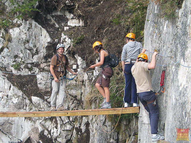The rope bridge at the beginning of the via ferrata acts as a traffic controler. In summer there are a lot of people, even idiots without helmets wearing tennis shoes. We even saw a guy from Neuchâtel doing it backwards! After a good yelling-at, this moron, whose behavior posed a fatal risk to all those climbing up, turned back the other way.